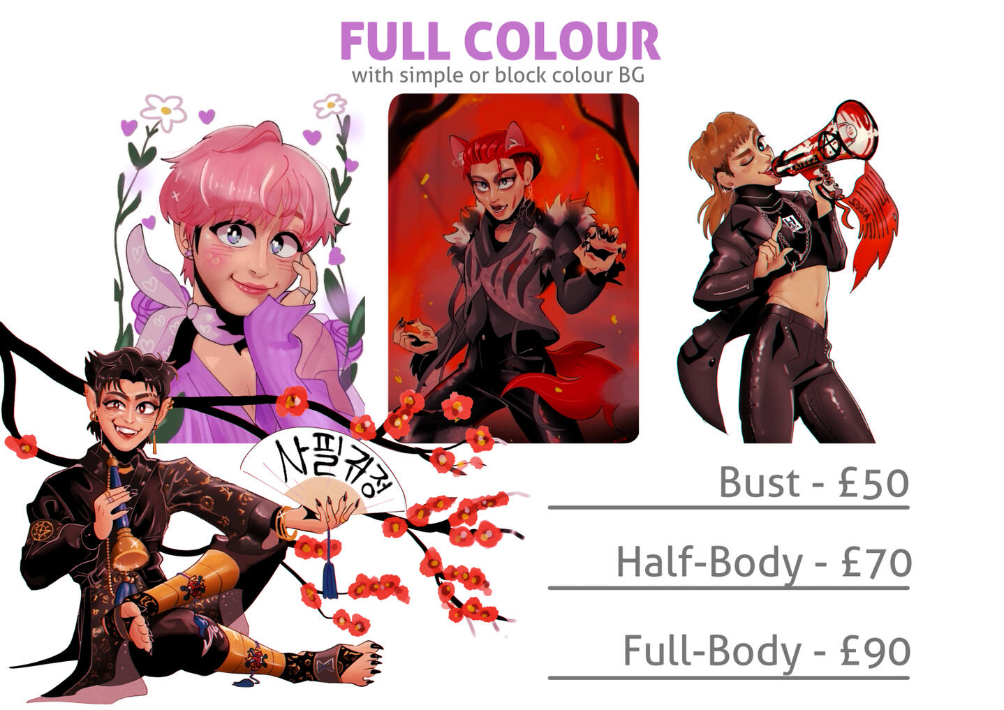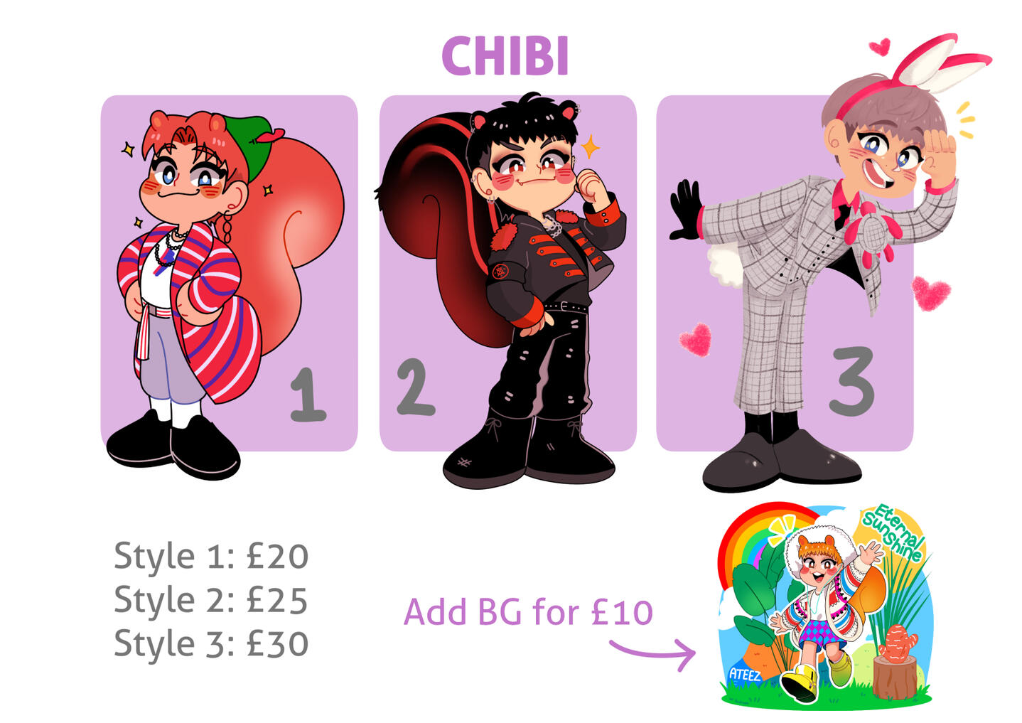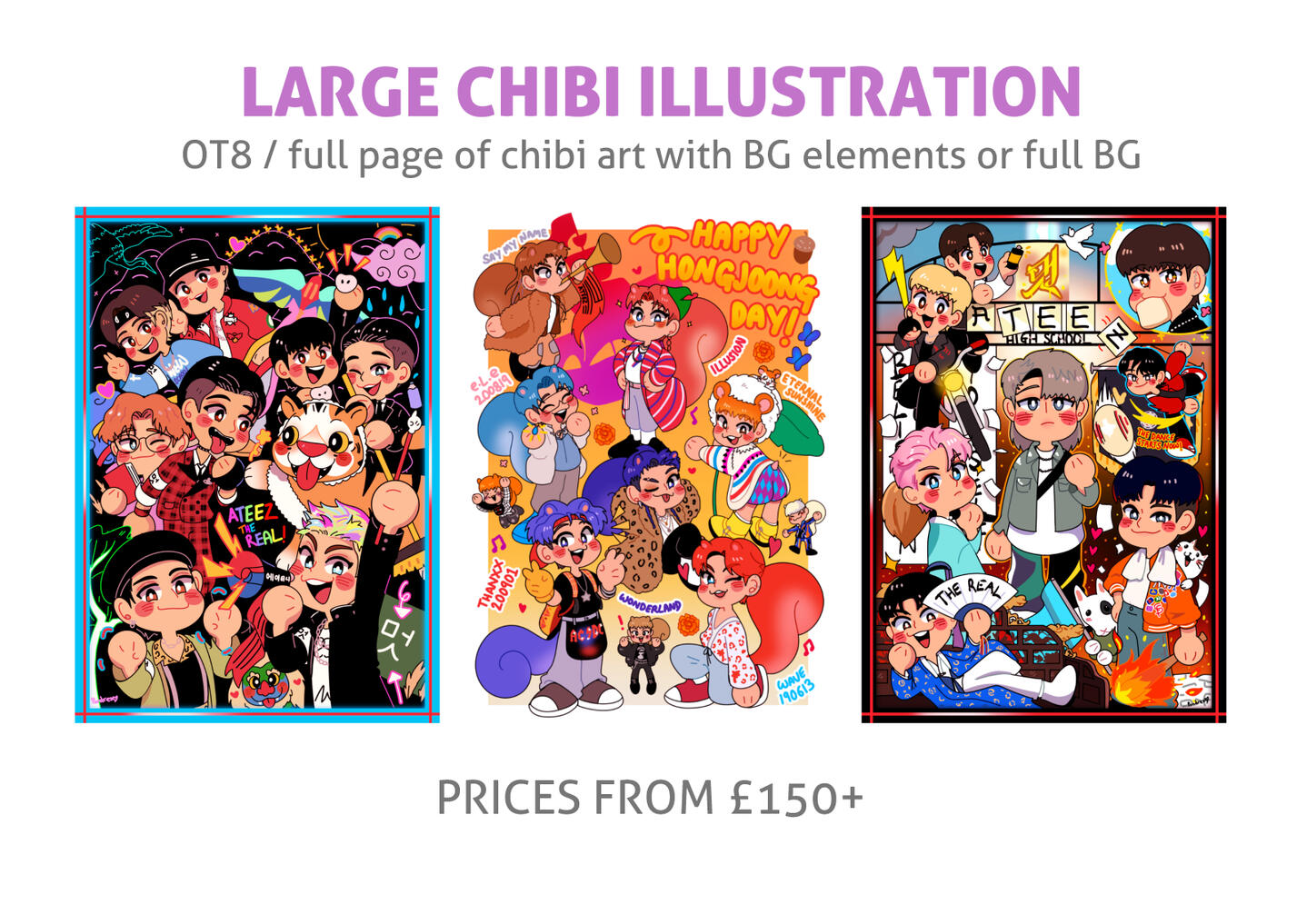 - PAYMENT – Must be paid in full and up-front via PayPal.- USEAGE - All commissioned art is for personal use only- TIMEFRAME – Full colour, full illustration and large chibi commissions will be completed within approximately one month of me starting them. Single chibi pieces will typically be completed within 2 weeks of me starting them.- REFERENCES – Please provide clear reference(s) at the point of commissioning. This will help me to draw what you are envisioning. You are welcome to give a general theme/idea/era for idol art, provided you are happy for me to do my take on it.- FIXES/AMENDMENTS – You may have a small number of amendments for free once the sketch has been approved and the main piece is being worked on. Repeated requests for amendments will be charged, so please have a clear idea of what you want unless you have specifically given artistic freedom.- COMMUNICATION – Please be assured that I will complete your commission within the given time frame. If, due to exceptional circumstances, I cannot, I will contact you with options. Please be aware that I will not be able to work on commissions every day and updates will likely be weekly.- Please note that I will generally be working on commissions at weekends. I may draw some personal art after my day job working hours.- If at any point I become uncomfortable with the commission, I reserve the right to cancel the process and will refund you.- WILL NOT DRAW: NSFWBack
